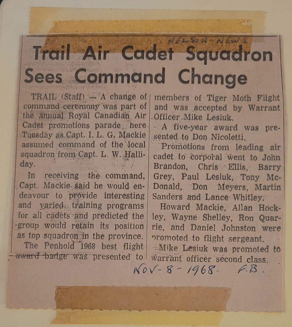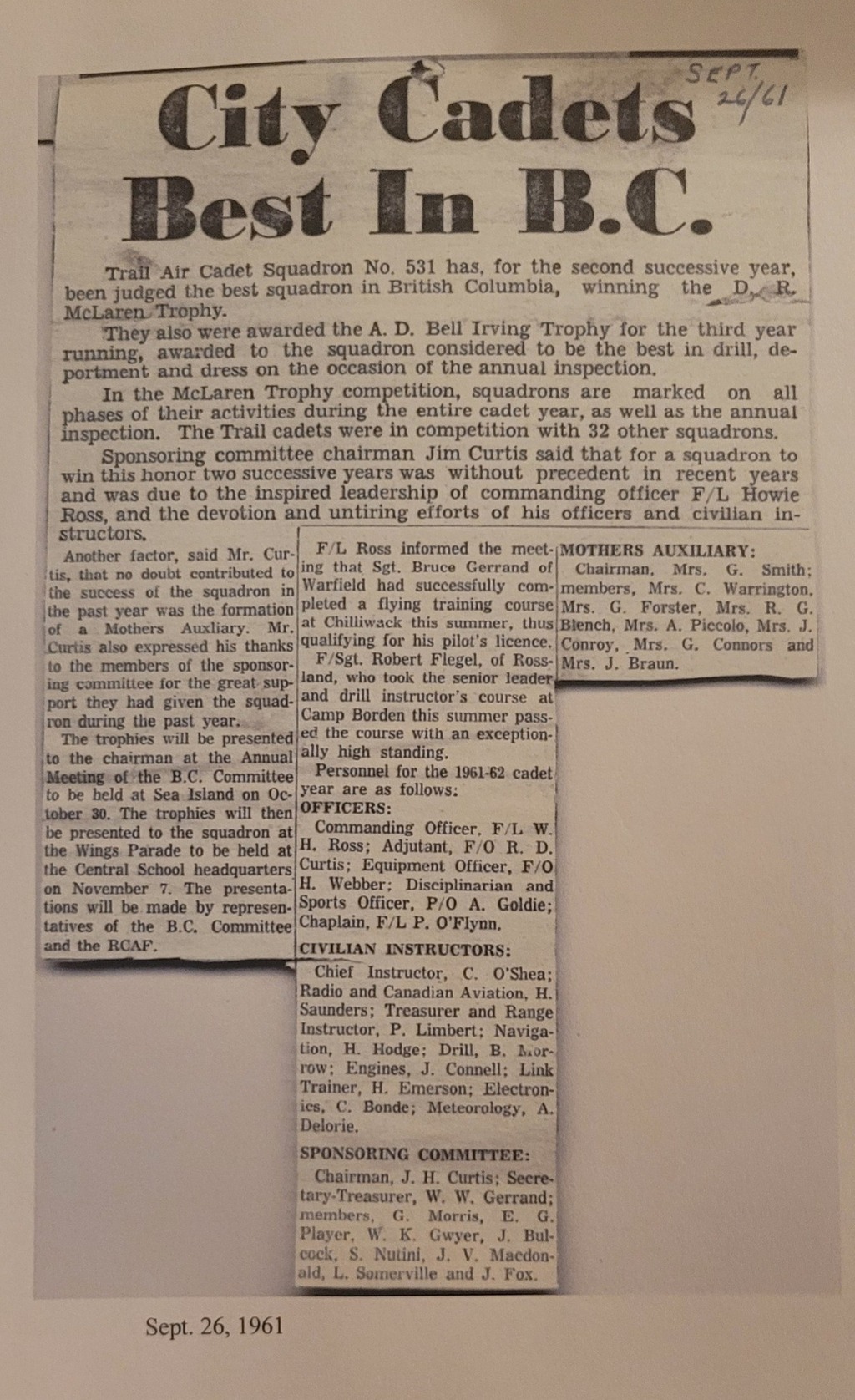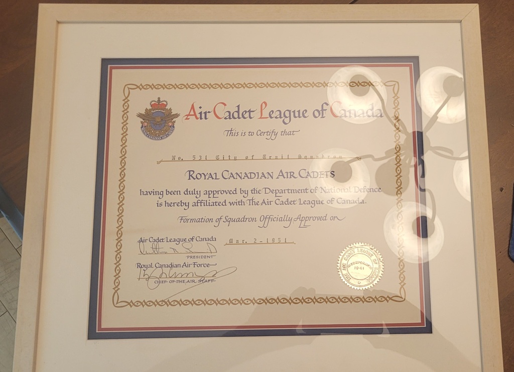 Initially, 531 paraded at the old Trail Armoury, the Arena and Legion. When the armoury closed in the early 1960's, the squadron moved to Central School in West Trail